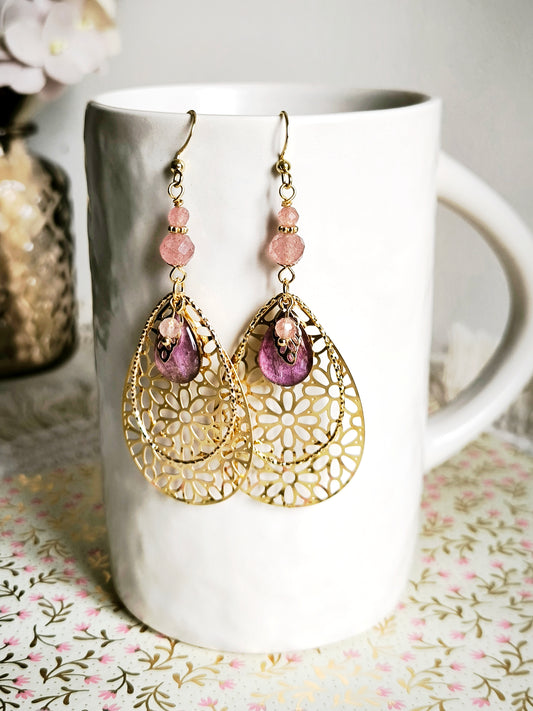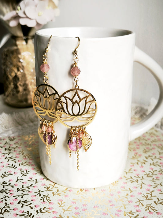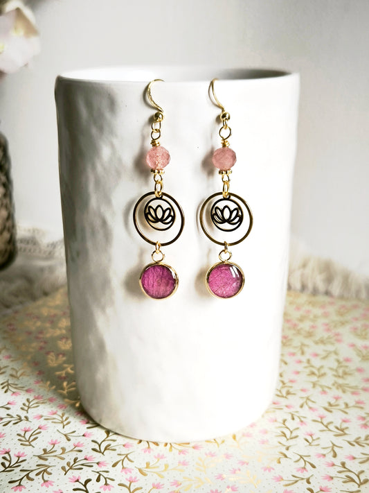 Une rencontre éclatante entre la grâce de l'orchidée rose et la tendresse du quartz fraise. L'orchidée symbole de féminité raffinée et d'amour subtil s'unit au quartz fraise, pierre associée à la joie du cœur et à la douceur émotionnelle.