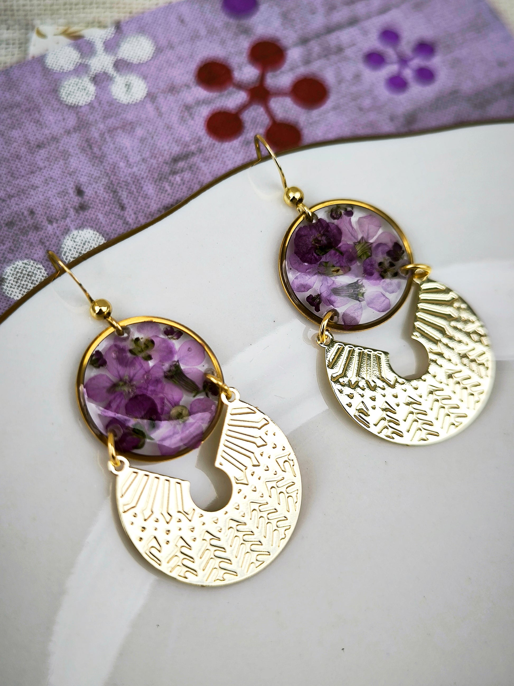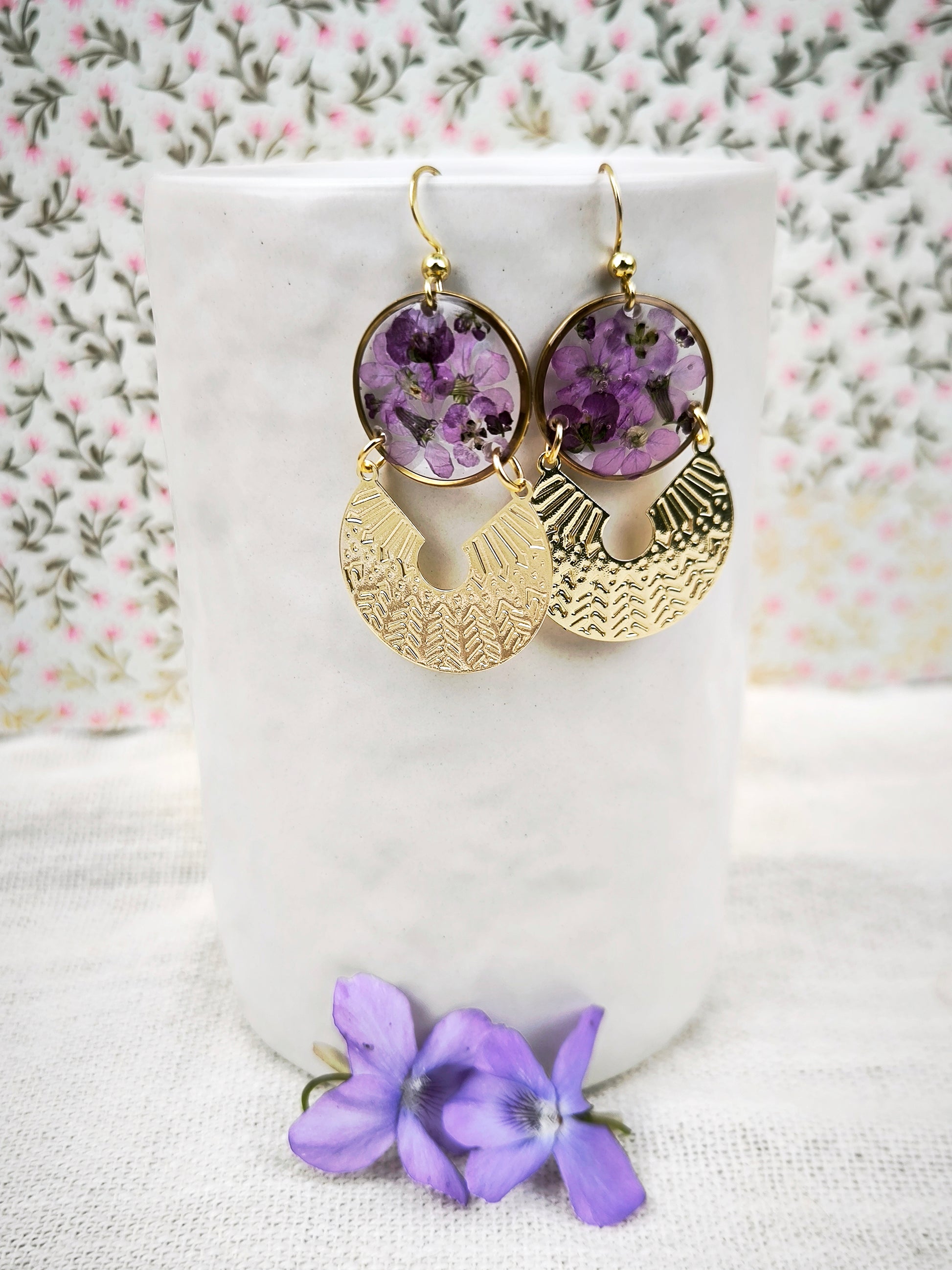 Boucles d’oreilles “Solar” – Alysse violette, fleurs naturelles & acier doré