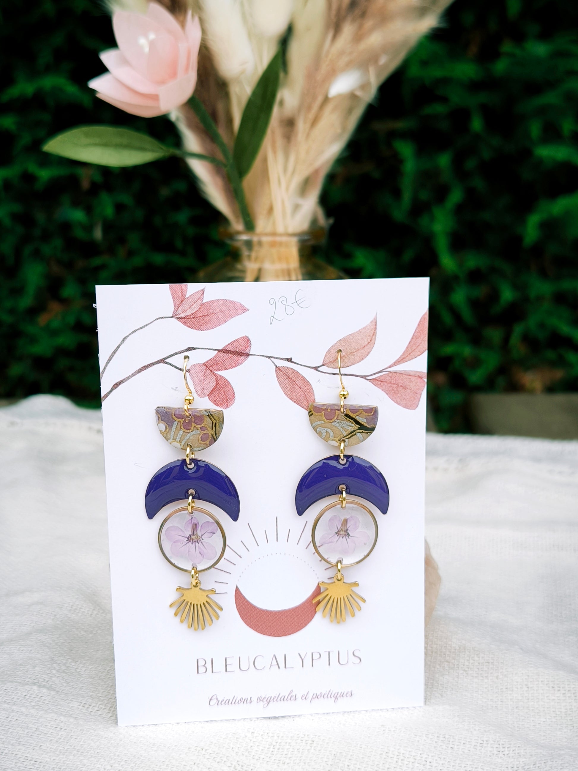 Boucles d'oreilles fleuries résine et émail : Croissant de lune : Violette