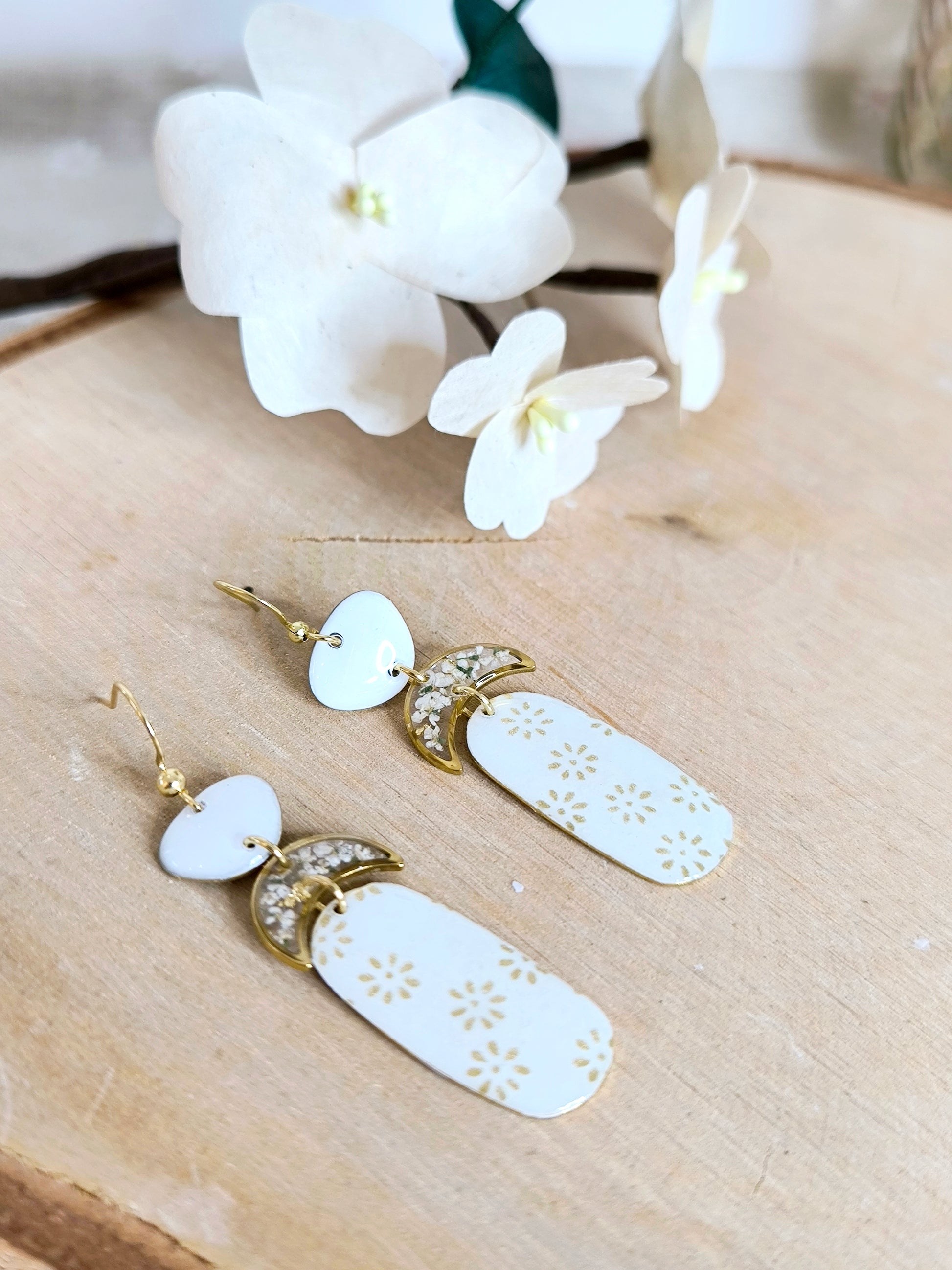 Toutes les fleurs sont cultivées dans mon jardin puis pressées et séchées dans une presse en bois garnie de papier recyclé. Je réalise seule dans mon atelier l'émaillage à froid et la mise sous résine de mes bijoux.