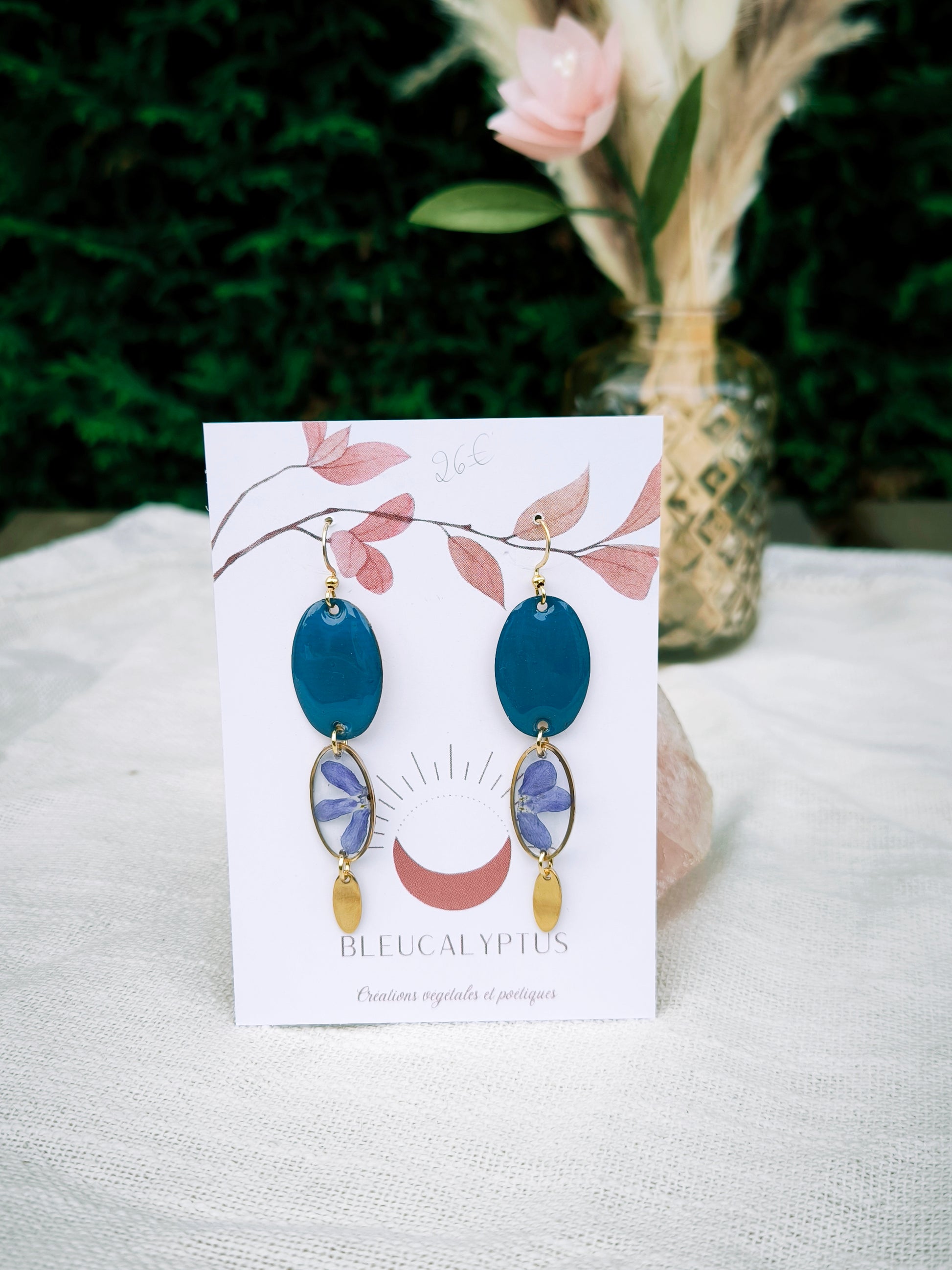 Boucles d'oreilles fleuries résine et émail : Ovale Pop - Bleu lobélie