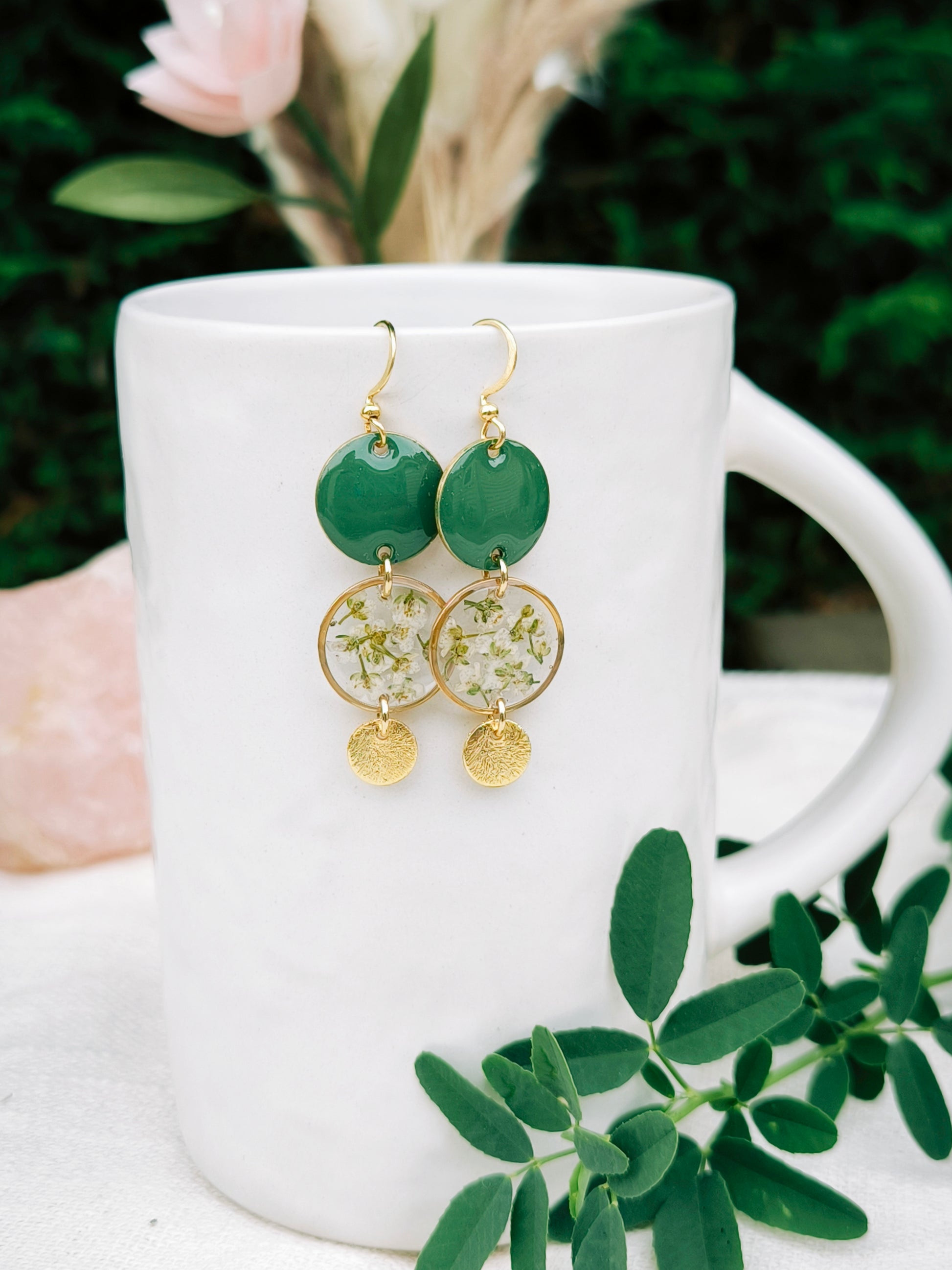 Toutes les fleurs sont cultivées dans mon jardin puis pressées et séchées dans une presse en bois garnie de papier recyclé. Je réalise seule dans mon atelier l'émaillage à froid et la mise sous résine de mes bijoux.