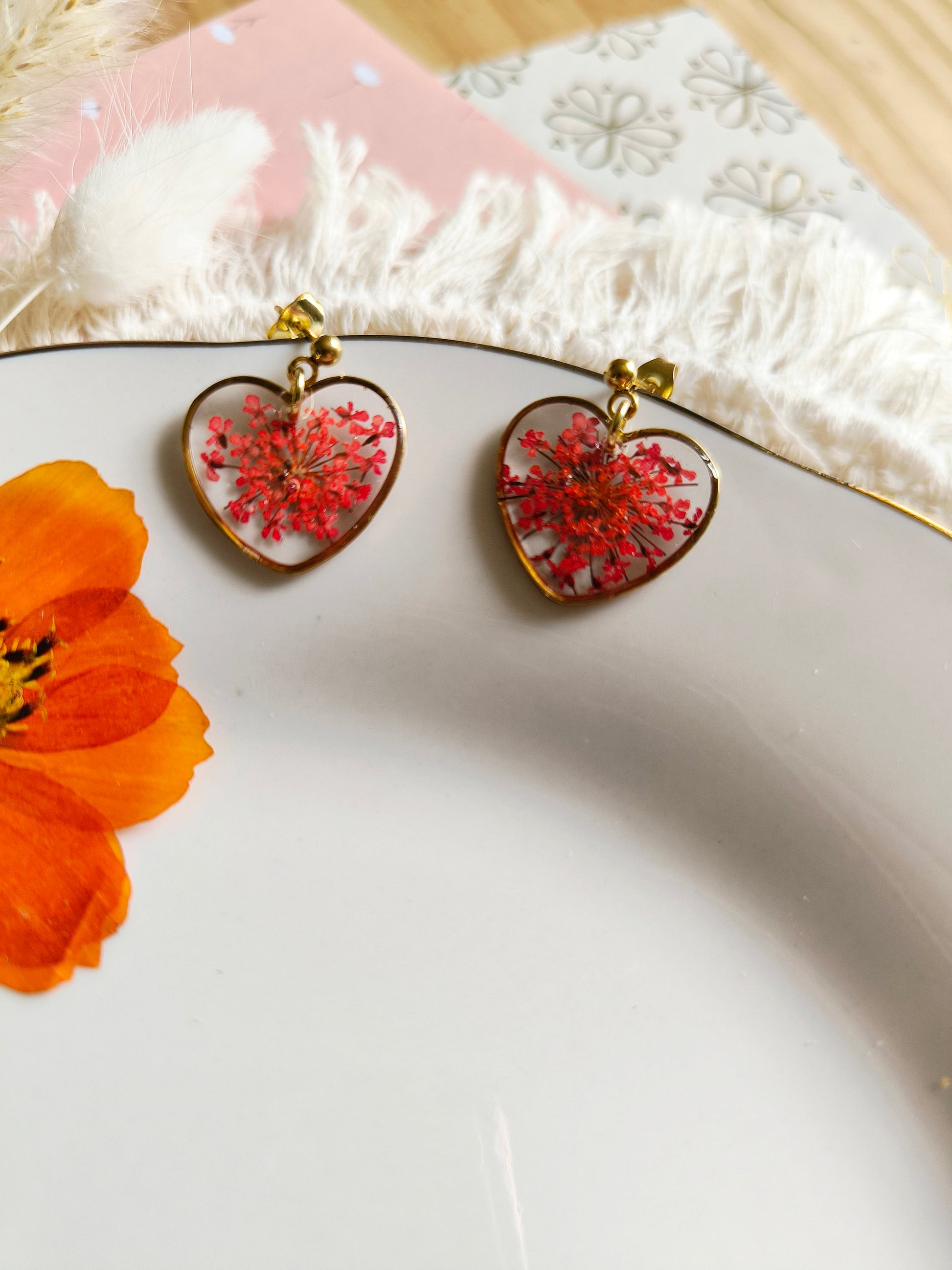 Réveiller l'âme sensible qui sommeille en vous avec ces délicates boucles d'oreilles en forme de cœur renfermant une dentelle de fleur de carotte sauvage.