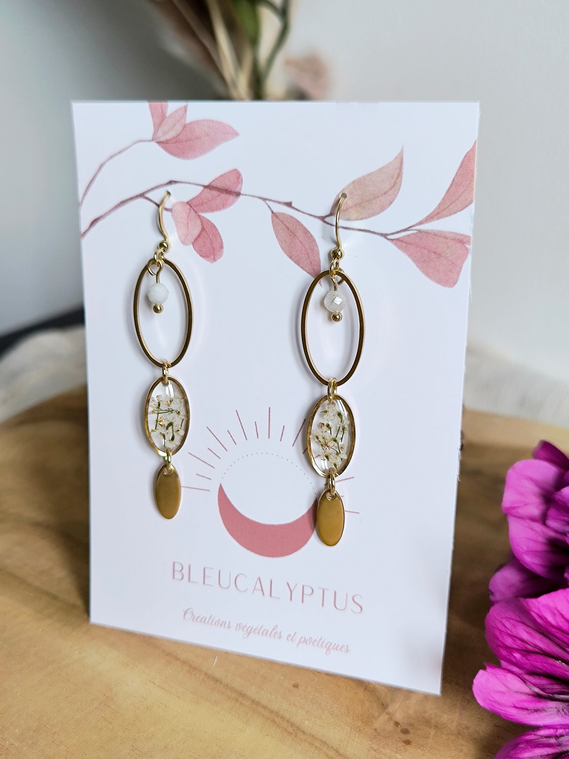 Ces boucles d'oreilles à l'allure bohème, doux mariage entre la force de l'acier doré et le végétal des fleurs apportera une touche d'originalité au quotidien des amoureux de la nature.