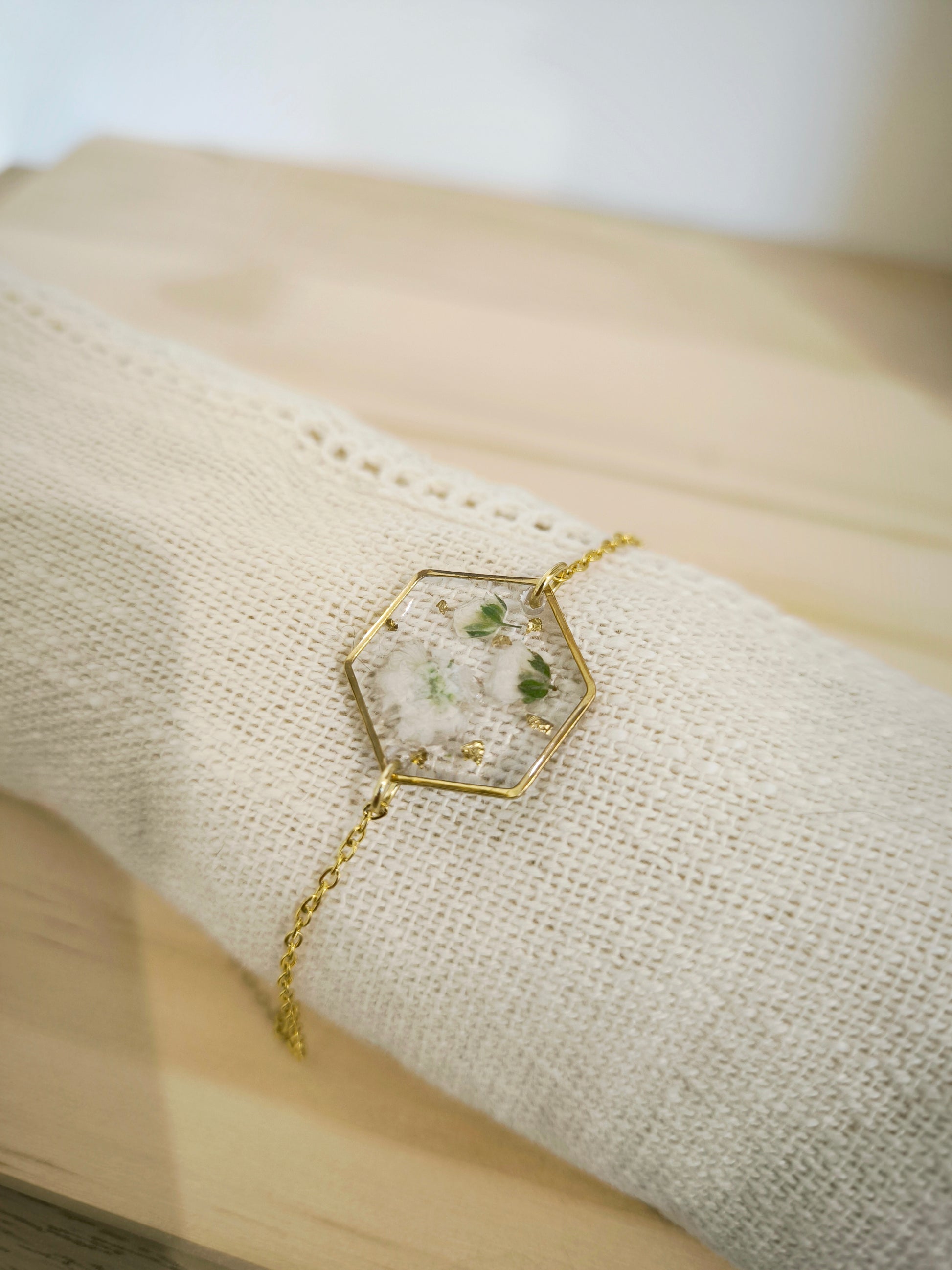 Un petit coin de nature à portée de main : Ce bracelet médaillon en forme d'hexagone met en valeur la beauté simple et pure de la gypsophile. Le contraste entre la délicatesse du végétal et la robustesse de l'acier doré crée un équilibre parfait pour ce bijou unique et raffiné à l'allure ancienne.
