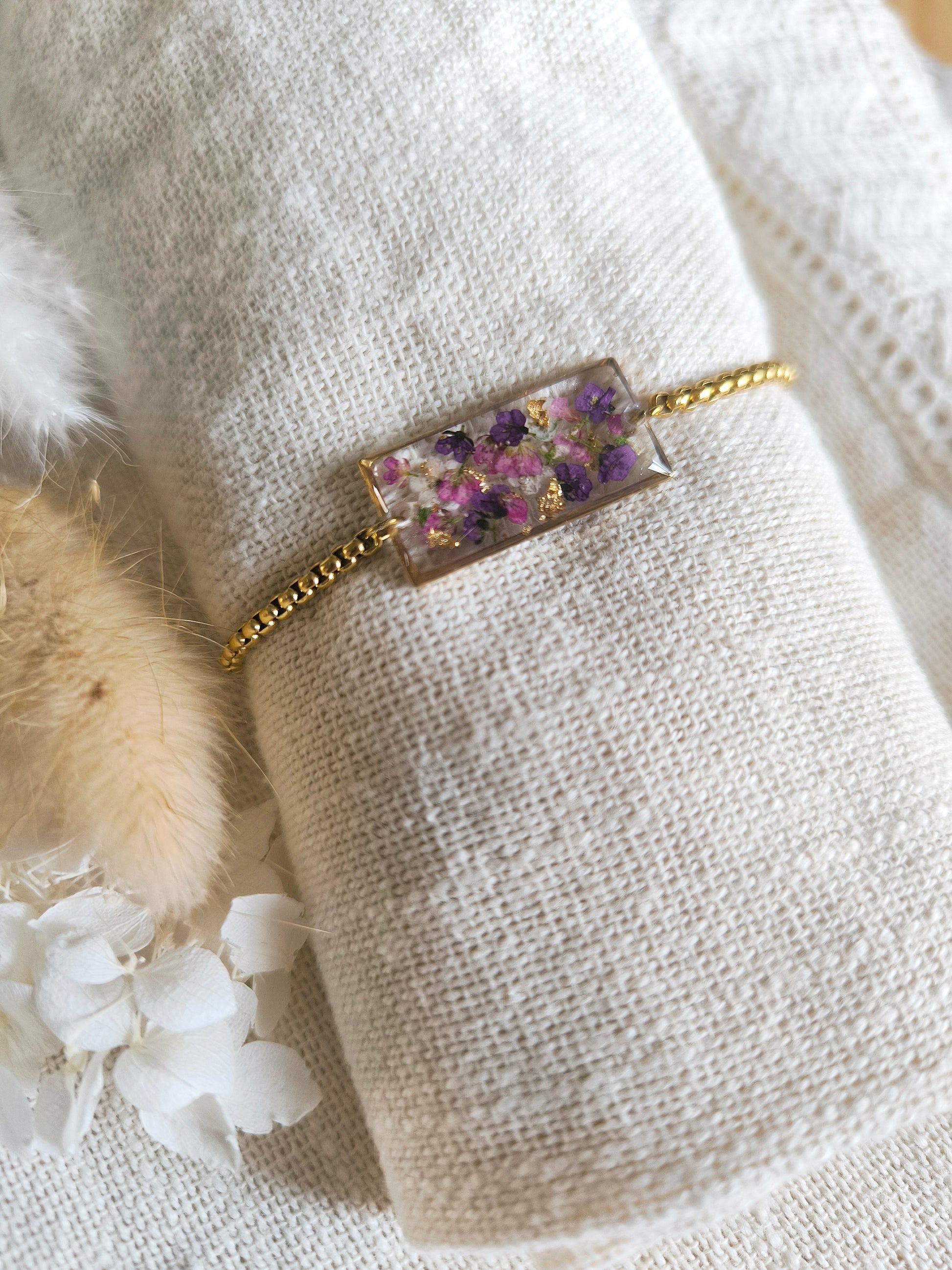Un petit coin de nature à portée de main : Ce bracelet médaillon en forme de rectangle met en valeur la beauté simple et pure des jolies fleurs d'alysse. Le contraste entre la délicatesse du végétal et la robustesse de l'acier doré crée un équilibre parfait pour ce bijou unique et raffiné à l'allure ancienne.