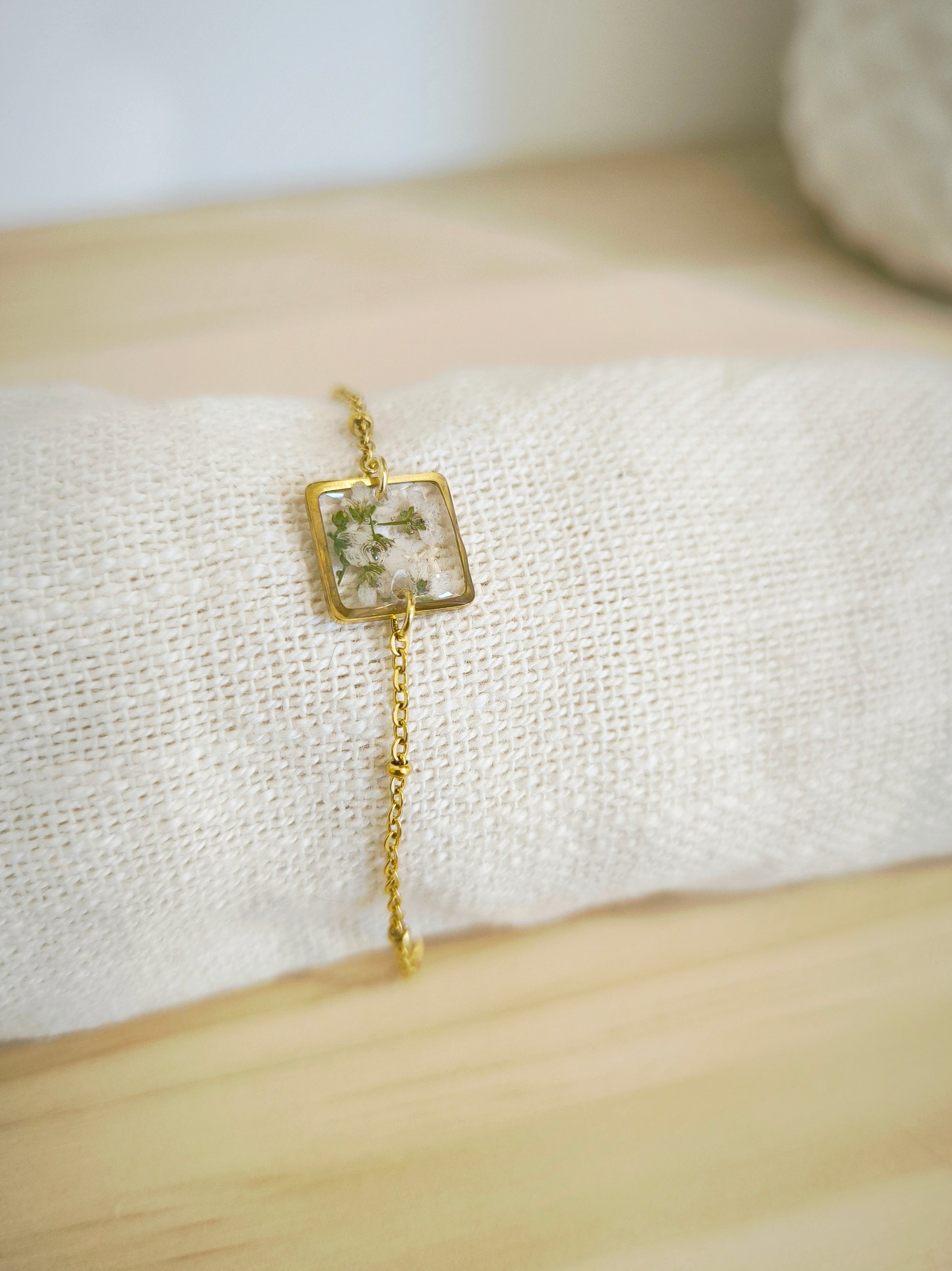 Un petit coin de nature à portée de main : Ce mini bracelet médaillon carré met en valeur la beauté simple et pure de la fleur de gypsophile. Le contraste entre la délicatesse du végétal et la robustesse de l'acier doré crée un équilibre parfait pour ce bijou unique et raffiné à l'allure ancienne.
