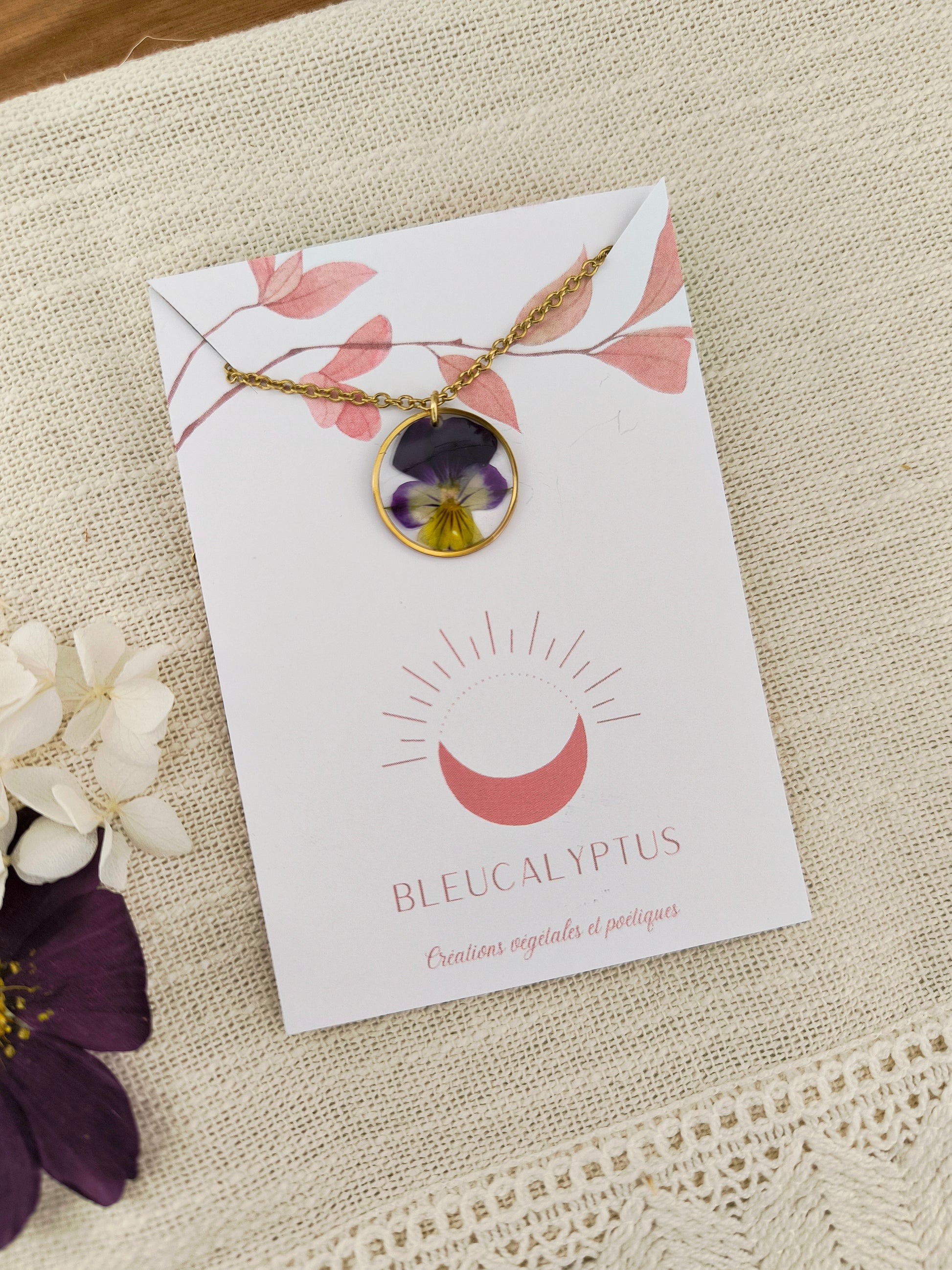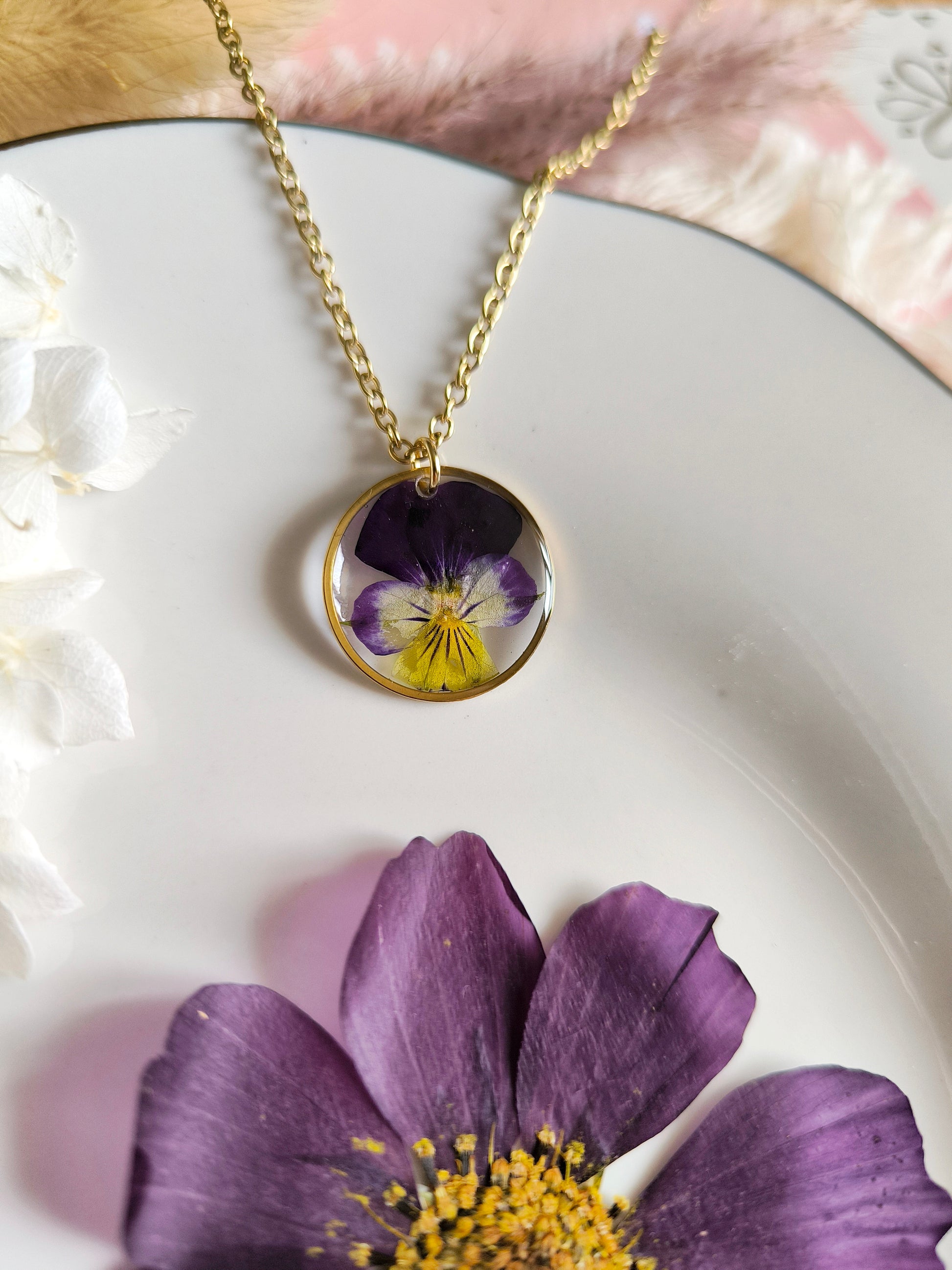 Un petit coin de nature à portée de main : ce collier médaillon rond met en valeur la beauté simple et pure des jolies fleurs de pensées. Le contraste entre la délicatesse du végétal et la robustesse de l'acier doré crée un équilibre parfait pour ce bijou unique et raffiné.
